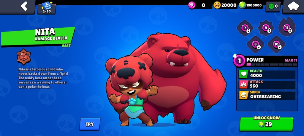 Nita est un choix équilibré et puissant grâce à ses dégâts constants, son excellent contrôle de la carte et la pression qu’elle exerce avec son ours. Ses attaques de base couvrent une large zone, ce qui la rend idéale pour repousser les ennemis. Son Super invoque un ours qui oblige les adversaires à se déplacer ou à gaspiller leurs munitions, offrant ainsi un espace précieux à votre équipe. Elle est efficace dans de nombreux modes de jeu, notamment ceux qui nécessitent un contrôle de zone.